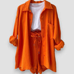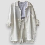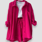 Frissítsd fel a gardróbodat a 2 részes Emilia szettel, amely a kényelem és a stílus tökéletes kombinációja. A túlméretezett ing és a passzos sortok laza és divatos megjelenést kölcsönöznek, ideálisak tavaszi napokra, a tengerparti sétáktól a pihenésig.