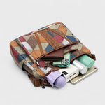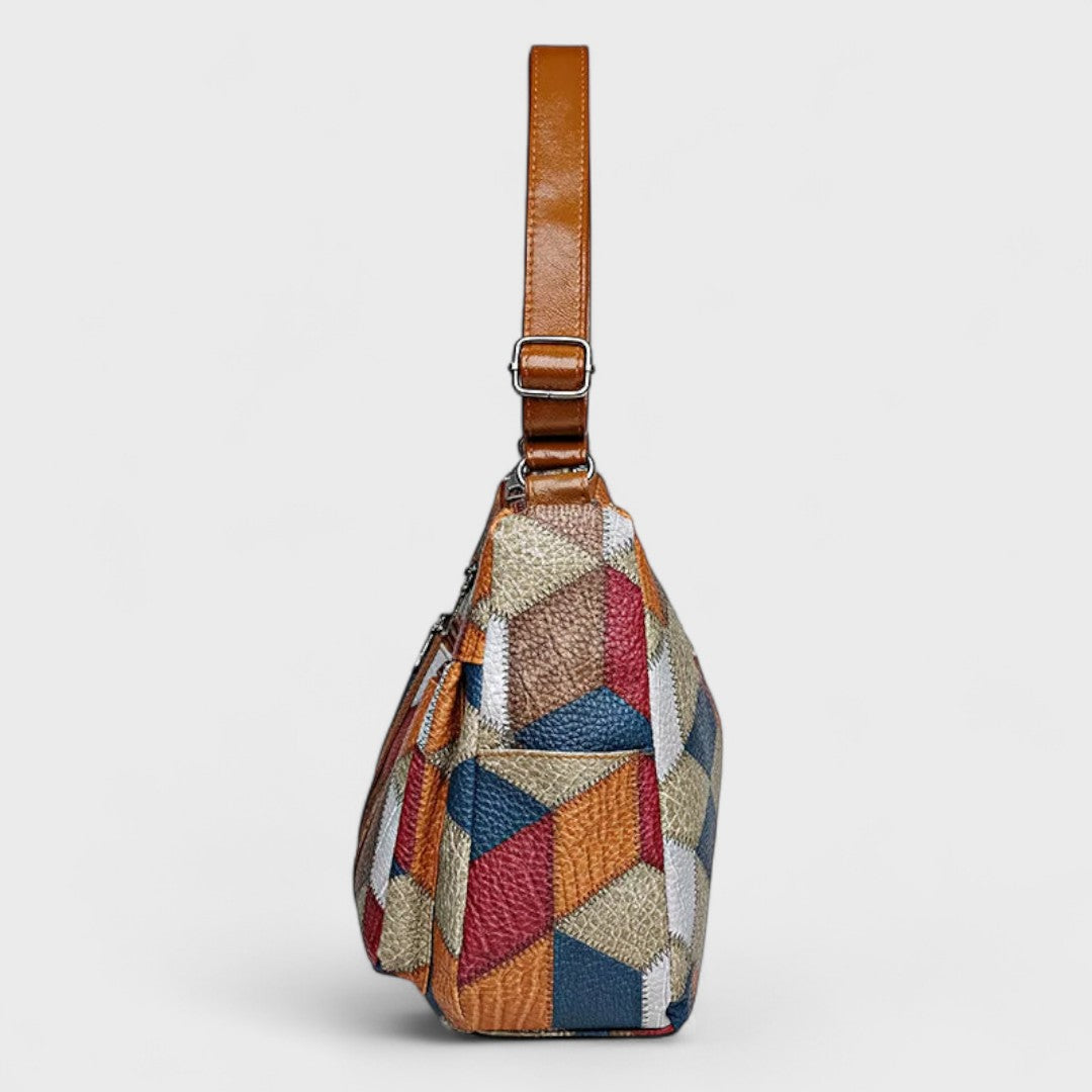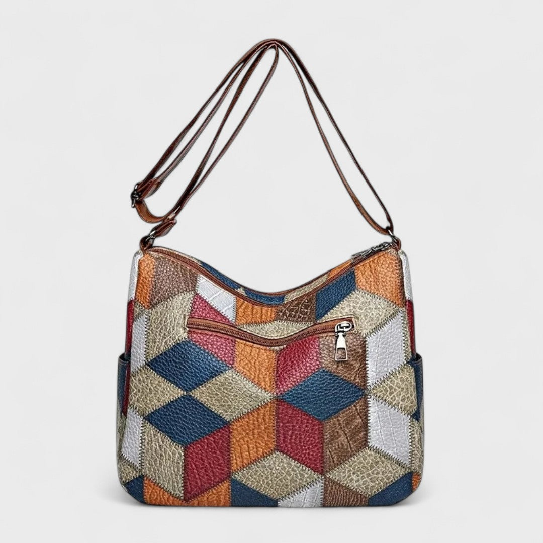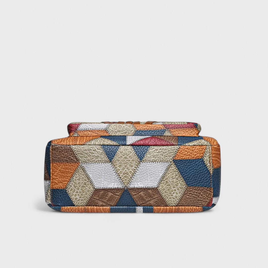 A gazdag geometriai patchwork, elegáns bőrállások és nagy rekeszek révén ez a táska a kifinomult stílust ötvözi a praktikummal, lehetővé téve a napi szükséges dolgok egyszerű tárolását.